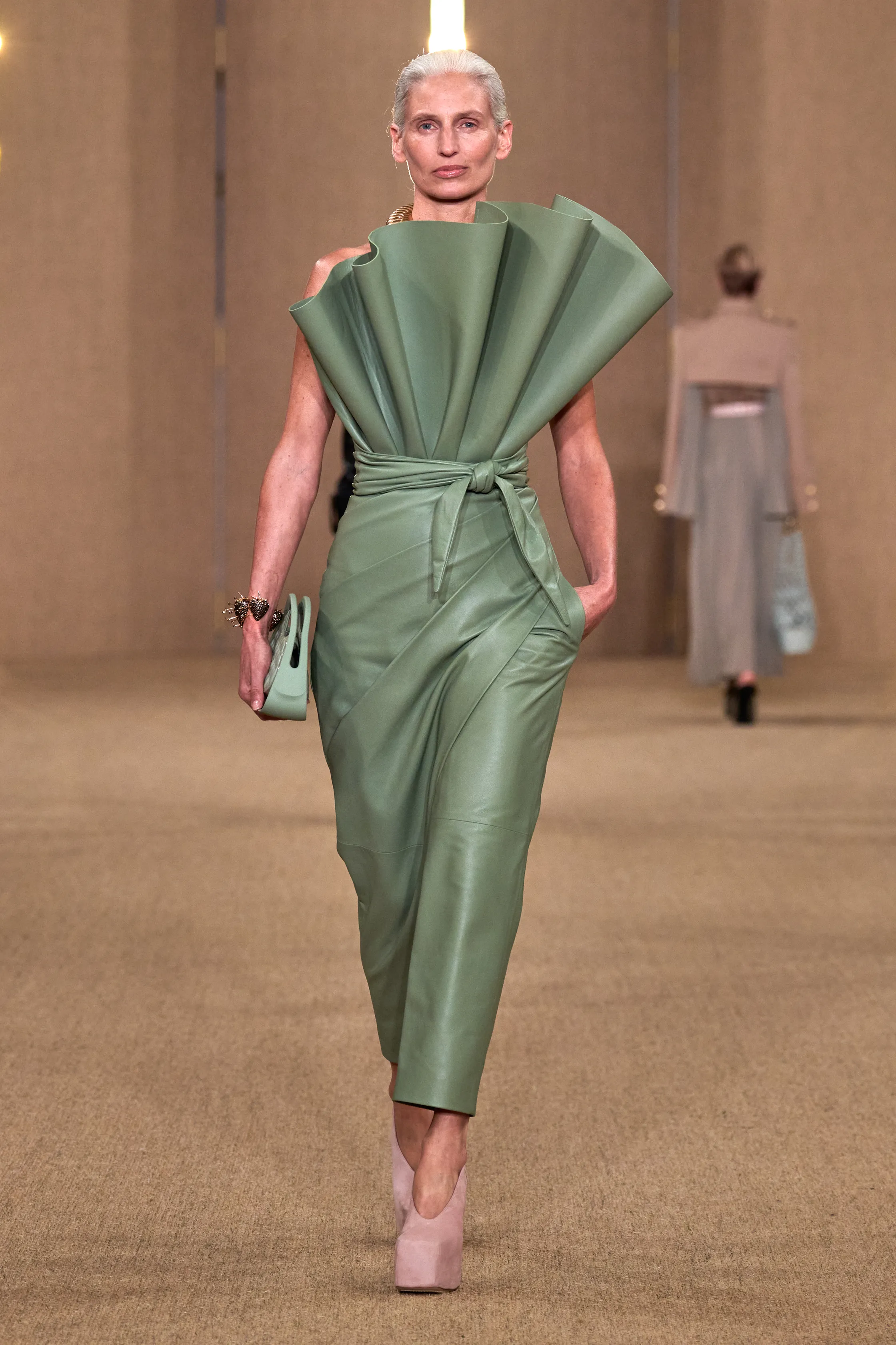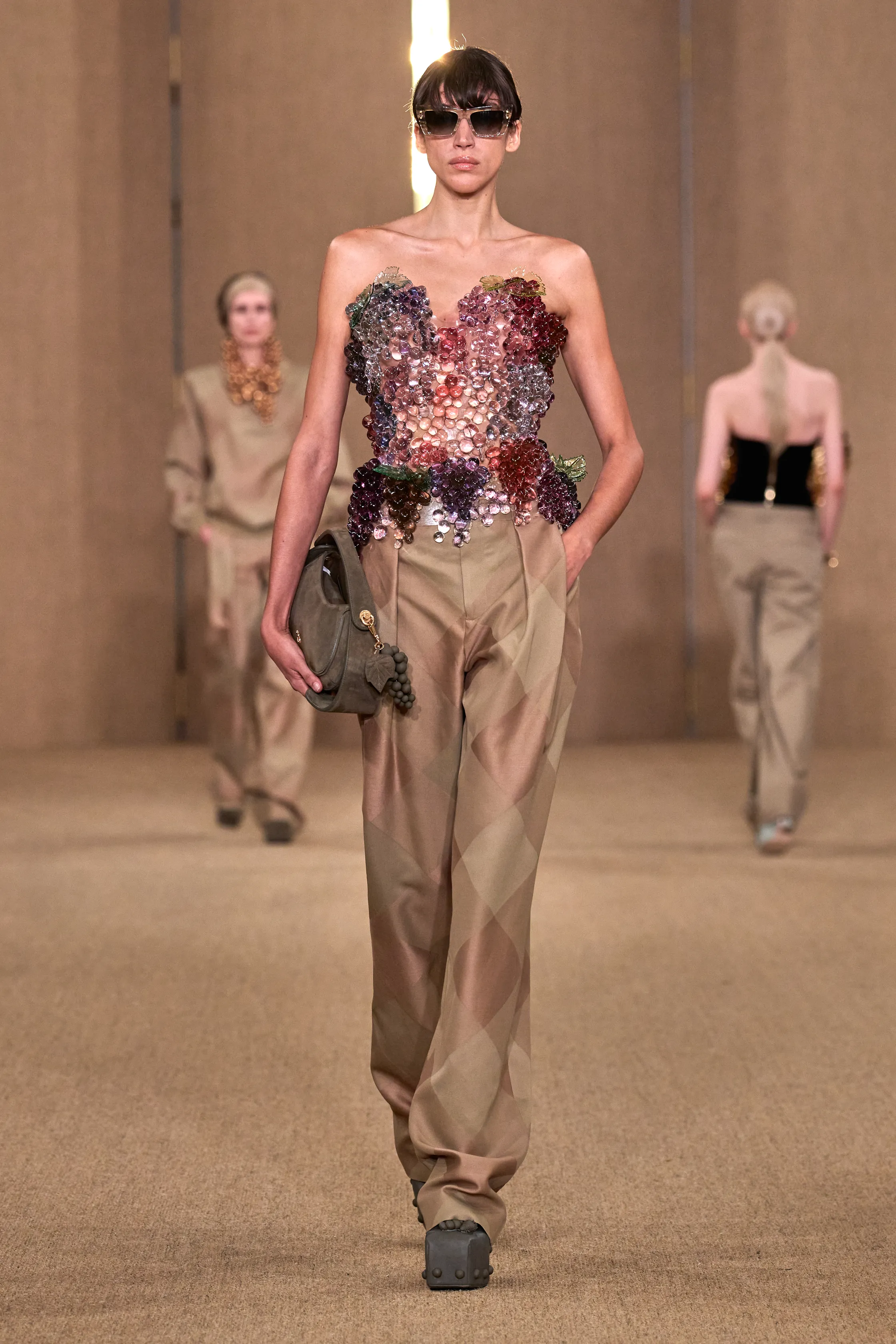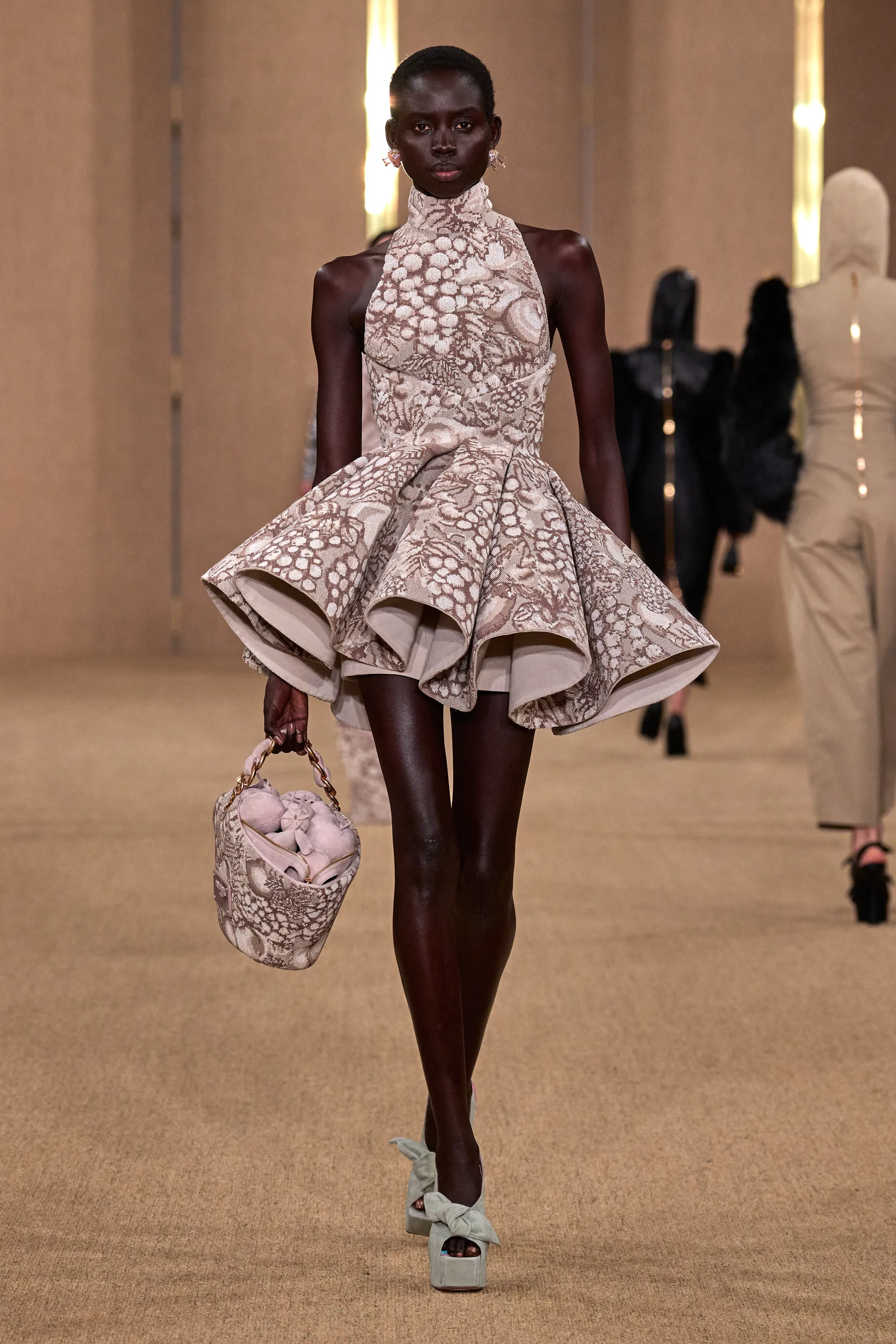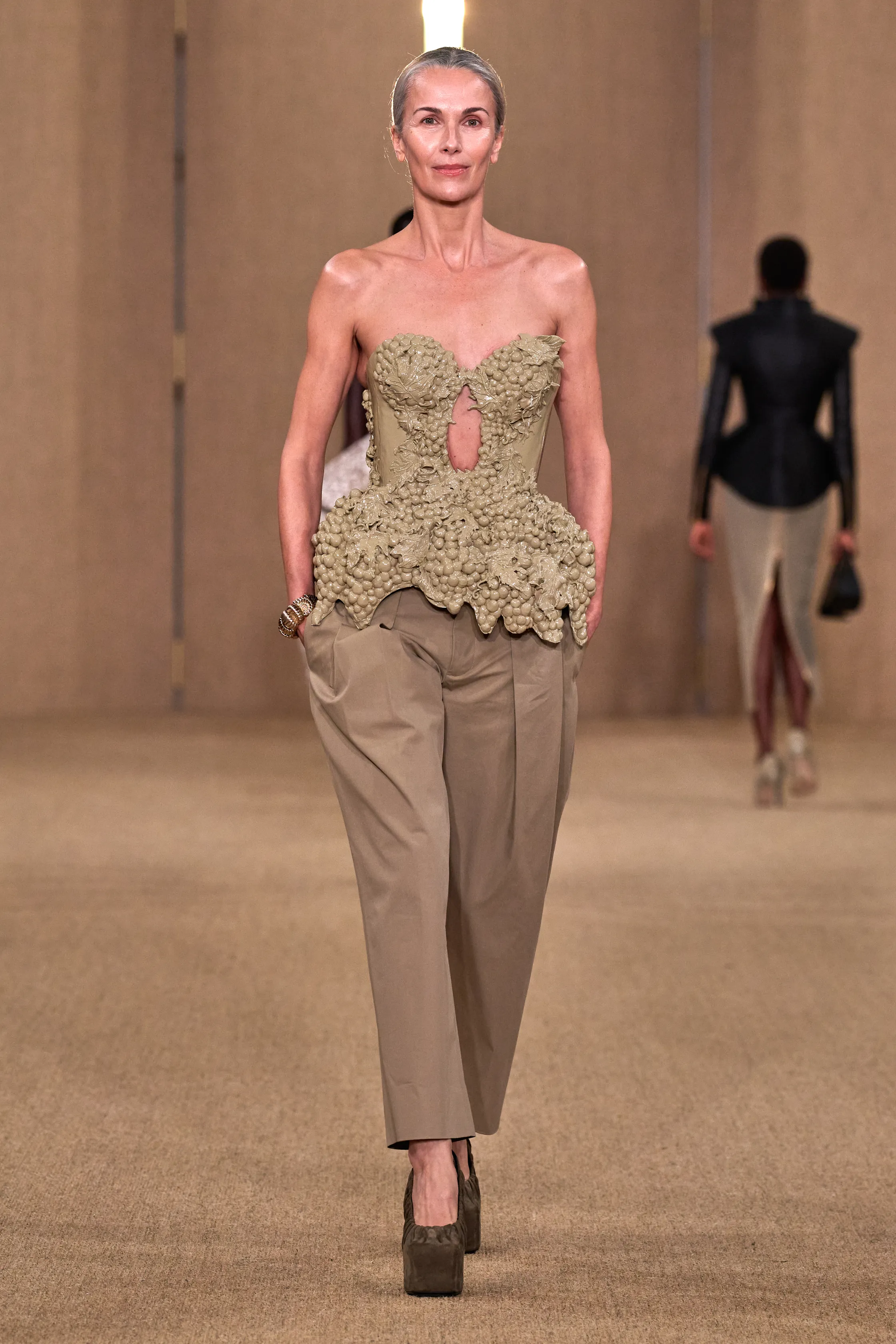 “Mamaja ime erdhi këtu sot dhe asaj i pëlqeu pamja,” tha ai para shfaqjes në prapaskenë. “Dhe ajo më kujtoi kujtimet nga fëmijëria. Ajo mbante gjithmonë një llogore – ju e dini, vërtet franceze – dhe ne shkonim në një piknik dhe hidhnim një batanije gingham në bar.” Nëse shfaqja e veshjeve për meshkuj të muajit të kaluar doli nga trashëgimia afrikane e Rousteing, ky vazhdim i veshjeve të grave foli për identitetin e tij si një Bordelais.